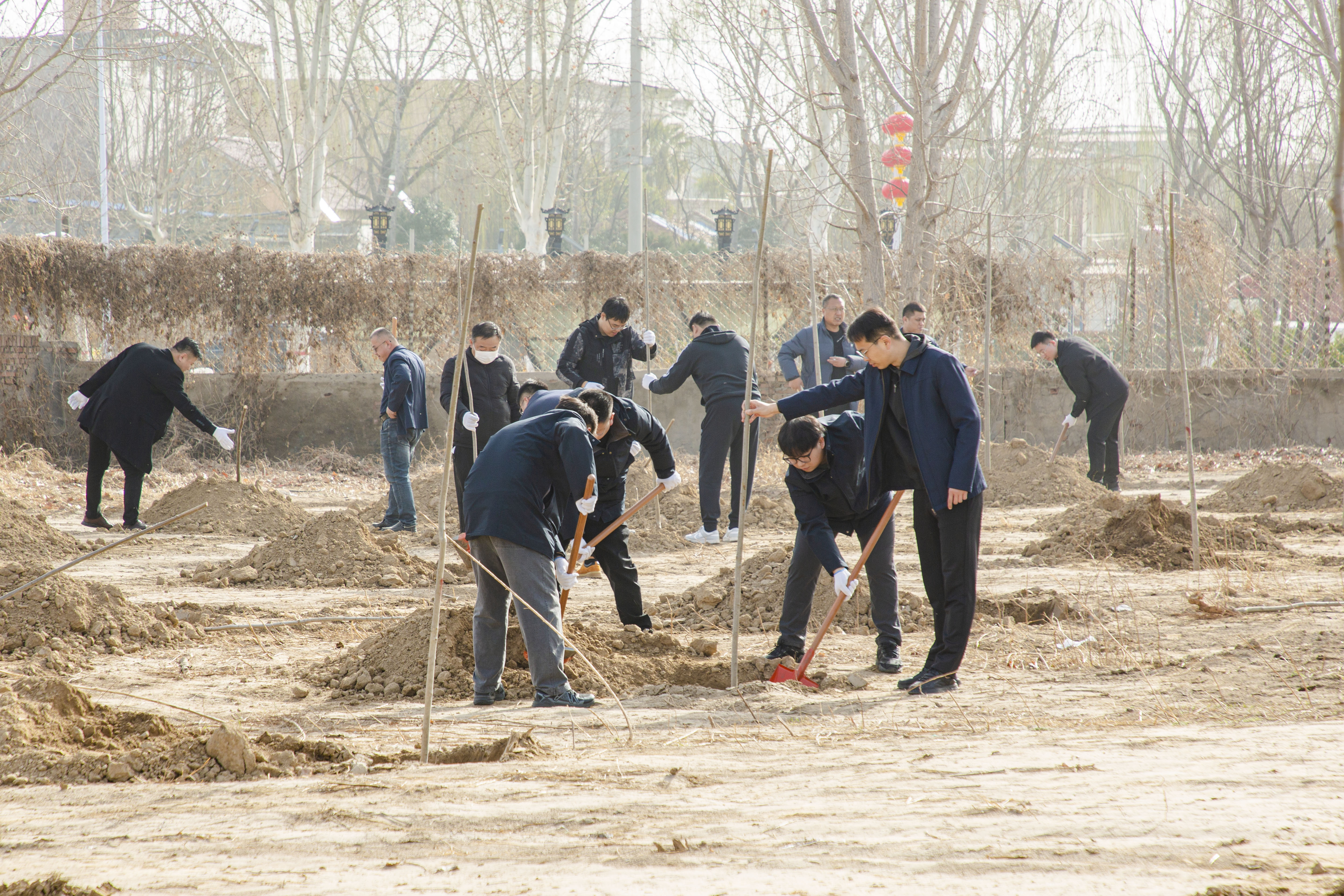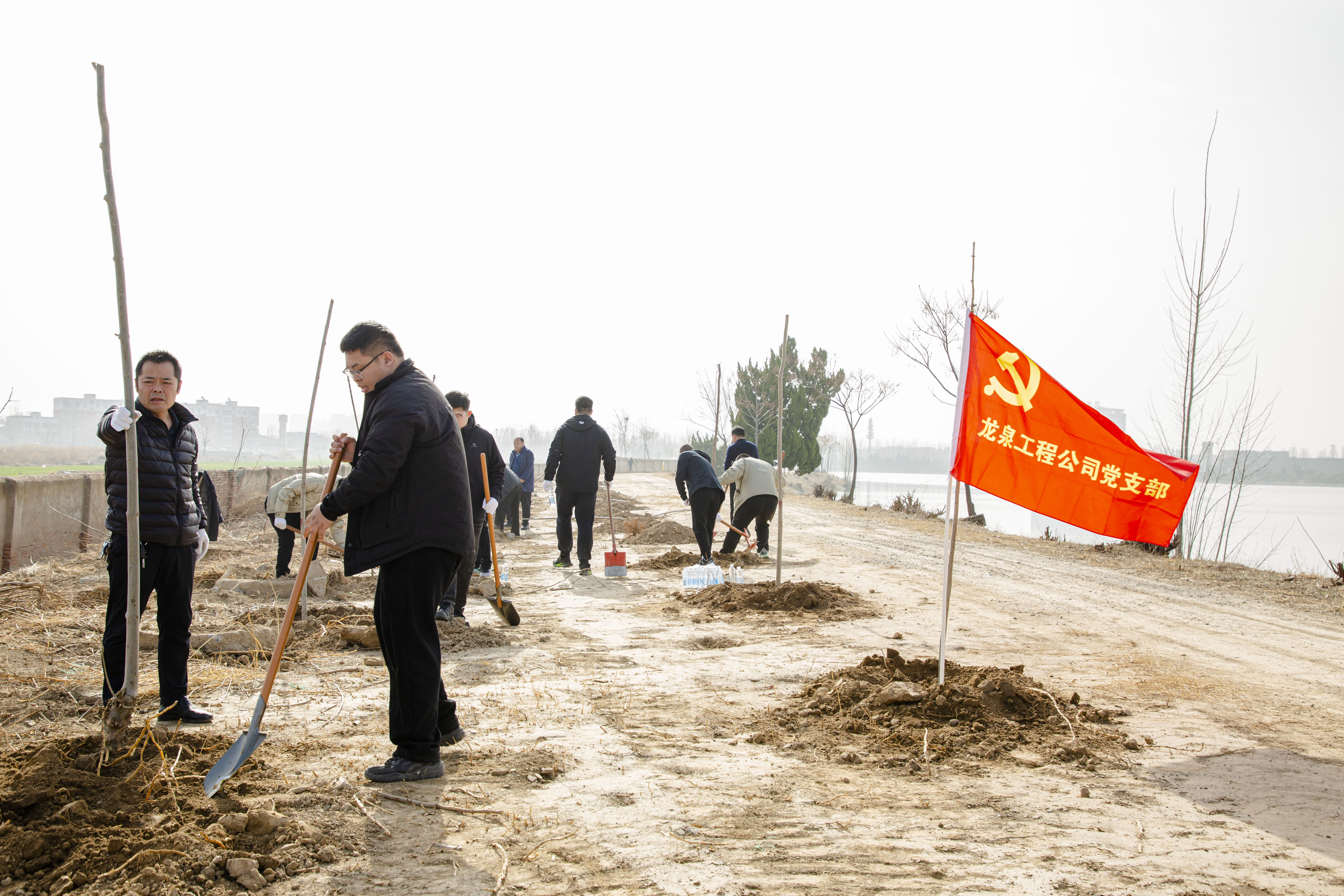 上午9時,西水坡調(diào)節(jié)池現(xiàn)場,鮮紅的黨旗迎風(fēng)招展。廣大黨員干部和職工們以黨支部為單位,兩人一組,默契配合,展開有序的“流水作業(yè)”,一人扶正樹苗,另一人揮鍬培土,隨后用腳將土層踩實(shí),最后拍成圓弧形圍堰。公司領(lǐng)導(dǎo)班子成員以身作則,全程參與,一邊培土一邊與職工親切交流。水廠黨支部率先完成任務(wù)后,轉(zhuǎn)身便跑去支援機(jī)關(guān)黨支部;龍泉公司的職工們不愧是干工程出身,最后成型的圍堰樹坑橫縱成線、弧度均勻;女職工們則細(xì)致入微,蹲身檢查每株樹苗的穩(wěn)固性,精心修正歪斜的圍堰。